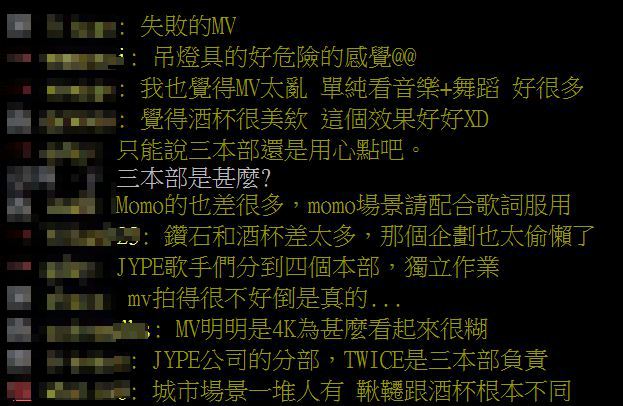 不過針對抄襲疑慮,台灣網友則認為此次MV拍攝場景本來就使用許多「老梗」,包括高樓大廈或是鞦韆都時常可見,並另舉出3個關鍵,轉而呼籲公司能重視MV拍攝品質。首先針對MV內容,除了太多老梗外,多數網友普遍認為畫質太低並表示「明明是4K為什麼看起來很糊」,也有人針對色調和轉場說到「我覺得色彩問題比內容大」、「黑色和彩色場景切換的很快」並認為MV完全倚賴TWICE成員的顏值撐起。