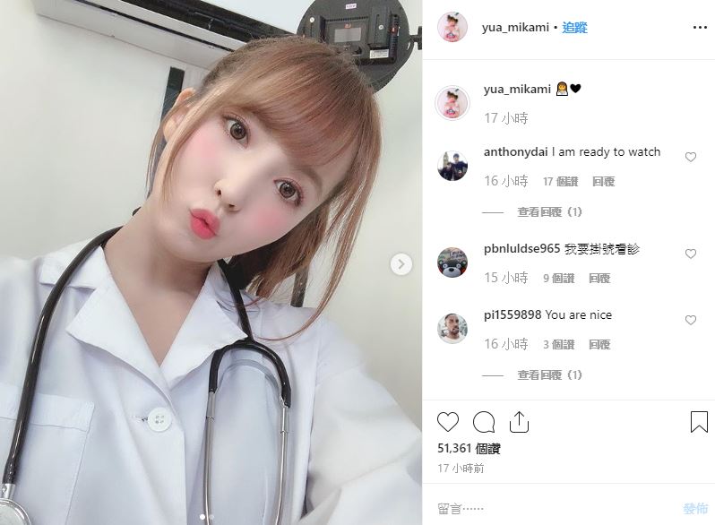 不過人在台灣工作的三上悠亞,仍不忘透過個人IG替粉絲謀福利,昨日晚間釋出一組身穿醫師袍的照片,看似保守穿著沒想到滑到下一張,三上悠亞竟大方解扣,醫師袍底下原來僅穿著三點式的比基尼,大秀性感好身材,引起大批網友興奮表示「我要去看醫生了」、「我好像生病了」、「好漂亮的女醫生」。