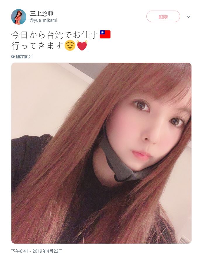 22日晚間,三上悠亞透過個人官方推特發文表示即將飛往台灣並說到「今天來台灣工作」,也隨文分享了一張自拍照,照片中的三上悠亞穿著十分輕便,而臉上也只有淡淡的妝容,引起大批網友盛讚「真的很漂亮」、「好可愛啊」,也有台灣網友現身表示「歡迎來到台灣」、「來台灣工作加油喔」。