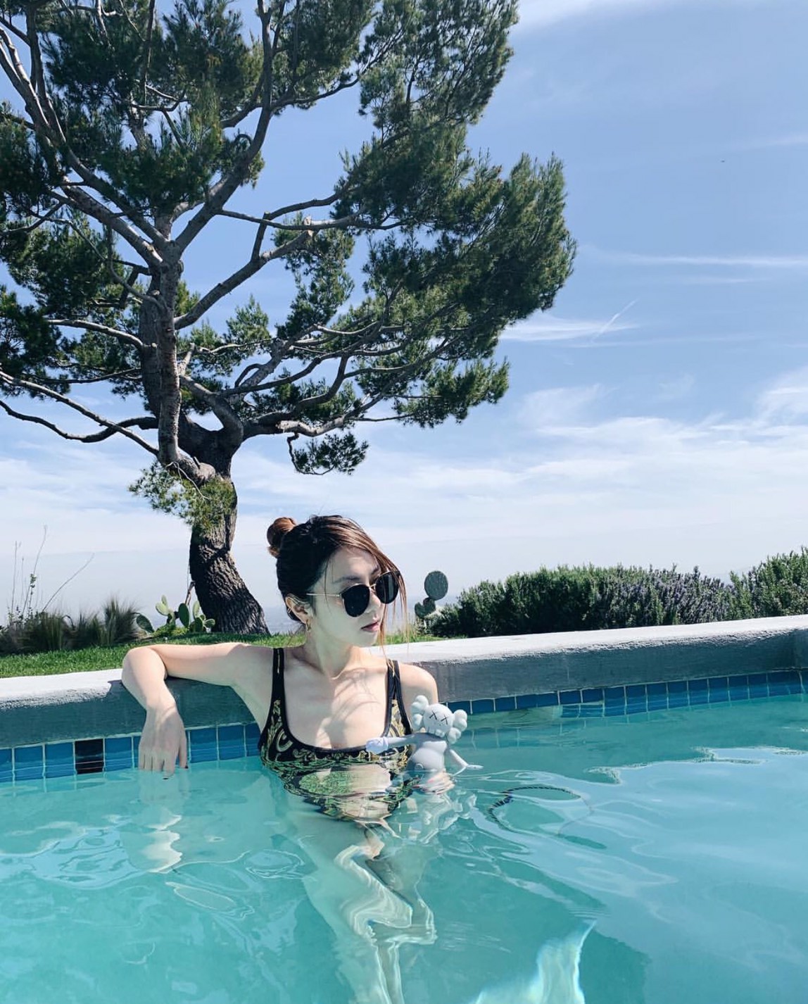 在開心發文預告的同時,也不忘附上2張泳裝辣照,露出甜美的微笑,心情看起發相當不錯。畫面中,綁著俐落的包頭,戴著墨鏡,身穿連身泳衣,胸口若隱若現,開心地在泳池中玩玩具,讓大票粉絲一飽眼福。