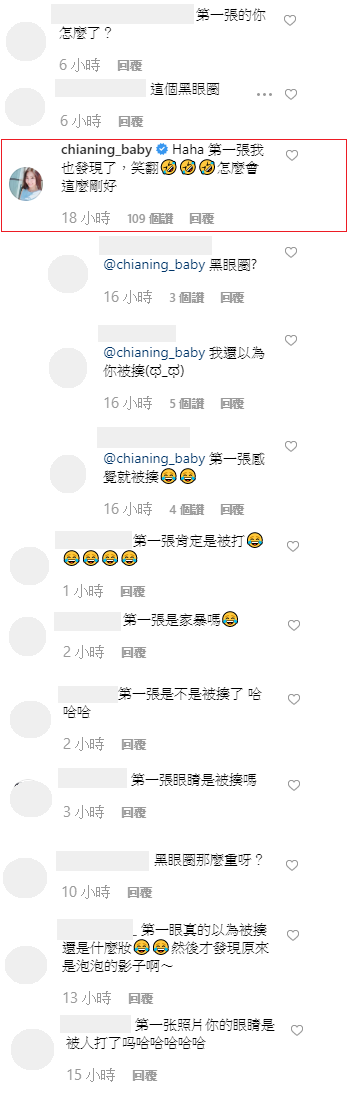 有不少網友都留言關心:「第一張的你怎麼了?」、「我還以為你被揍(ಥ_ಥ)」、「第一張感覺就被揍」、「第一張肯定是被打」、「第一張是家暴嗎」、「第一張是不是被揍了 哈哈哈」,而家寧自己後來也回應:「Haha 第一張我也發現了,笑翻,怎麼會這麼剛好」。