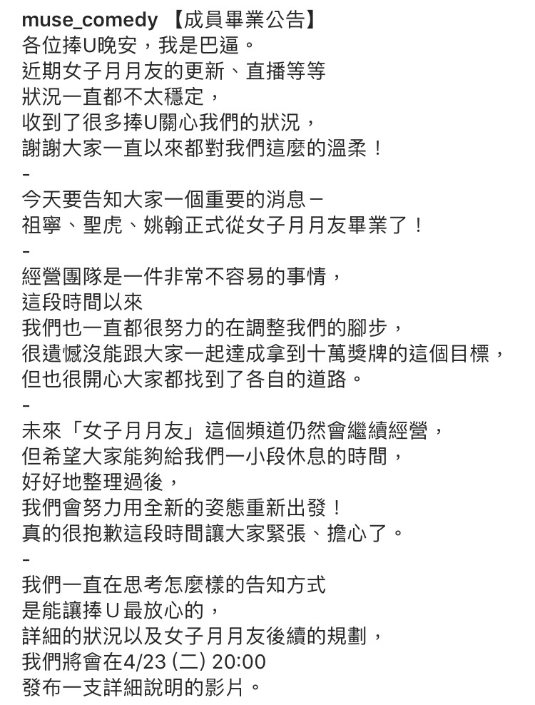 Youtuber團體「女子月月友」,是由一群喜愛拍片和演戲的世新大學生共同創建的頻道,其中成員包含巴逼、林玄、聖虎、姚翰以及祖寧等等,他們都熱愛這個團隊,但近期卻傳出成員相繼出走的消息,讓許多網友相當擔心,而女子月月友也在4月23日發布了影片,向粉絲說明團員離開的原因。