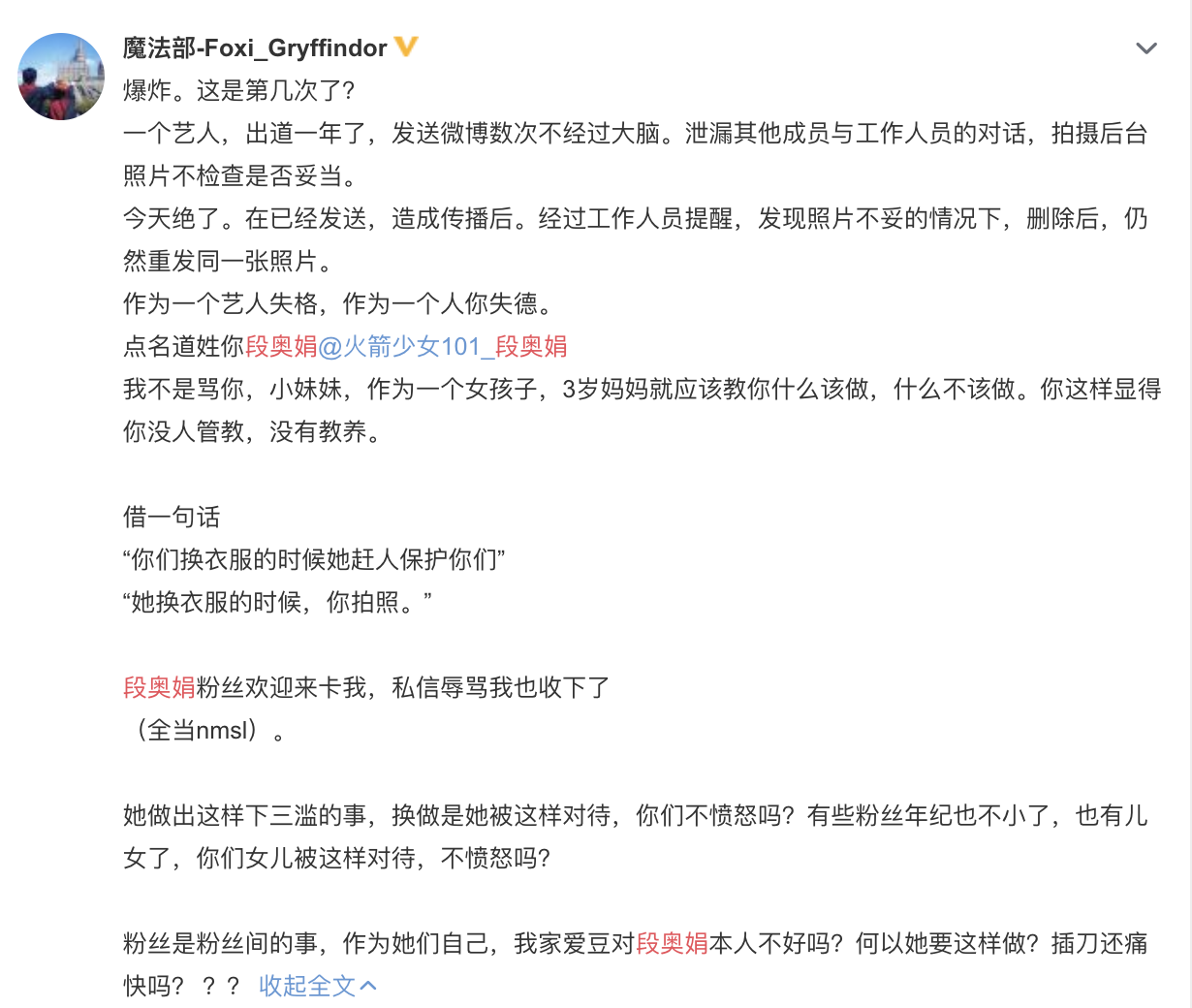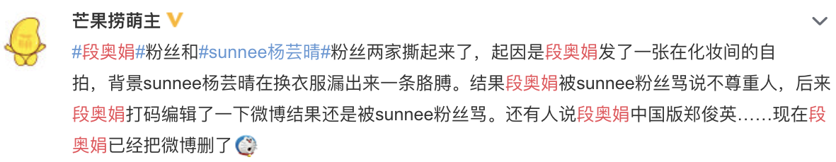 昨日火箭少女的8位成員受邀參加湖南衛視航天晚會,而在晚會上她們也帶來精湛的演出,然而在演出完畢後成員段奧娟在微博上發布了她和其他成員的自拍照,但後方Sunnee正在換衣服,露出了裸露的肌膚。根據網友整理得事發過程指出,當時有工作人員提醒段奧娟這樣似乎洩露了團員的隱私,然而段奧娟僅將照片加上一層薄薄的馬賽克,第二次被提醒時當下刪除了卻重發一張一樣的照片,對此Sunnee的粉絲相當憤怒的在微博上發文痛批段奧娟:「作為一個藝人失格,作為一個人你失德」。