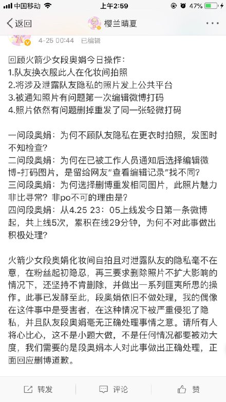 該位博主更在留言區補充:「首先換衣服就是非常私密的行為。你要是願意,穿比基尼上台也沒關係,要是在別人未知情況下,那麼無論發到哪裡,露哪裡都不行,這件事重點在,被提醒後,段奧娟本人明知不對,刪除後,還要發同一張圖,是什麼居心?告訴別人『快來看啊我打碼啦,大家來找不同啊?』」,其他粉絲也紛紛留言聲援,並要求段奧娟出面道歉,更有網友痛批她這樣的行為根本是「中國版鄭俊英」,粉絲們都感到相當憤怒。