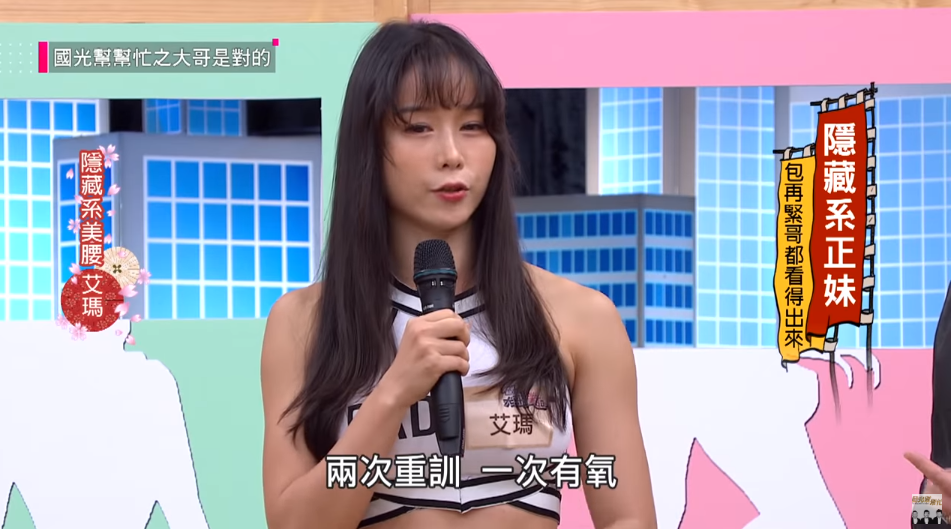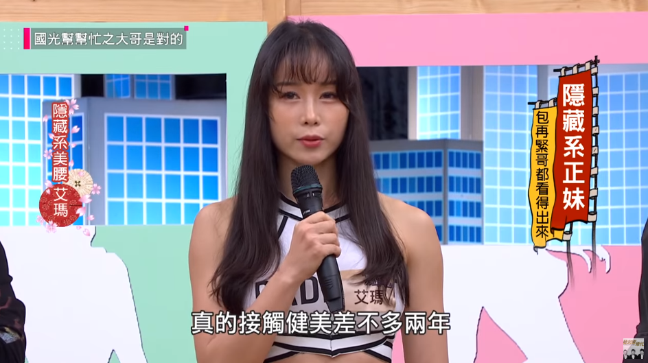 艾瑪近日上節目《國光幫幫忙》,擔任節目中隱藏系美腰的代表,而出場之後,她玲瓏有致的體態也引起主持人及其他來賓的關注,尤其主持人還大讚:「你的胸也是了不起」!艾瑪也提到自己接觸健身約兩年的時間,幾乎每天都練三次,兩次重訓、一次有氧,才能練出一身令人羨慕的肌肉。
