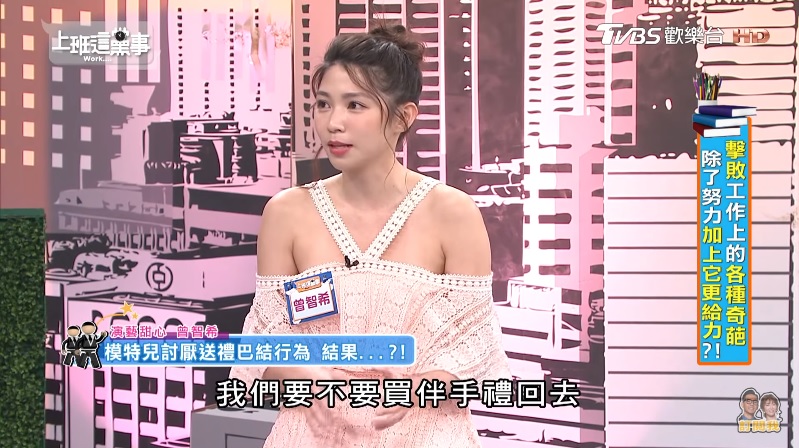 曾智希常常在社群平台分享生活照,甜美親民的形象,深受不少粉絲愛戴,近日她受節目《上班這黨事》邀約,該集主題為「擊敗工作上的各種奇葩」,曾智希表示,有一次該名女模跟她聊天,提到其他模特兒出國都帶禮物送工作人員,並跟她抱怨:「天啊,她們這些人真的是很心機,為什麼要這樣巴結?這樣巴結工作會比較多嗎?」當下她只用「嗯嗯」帶過。