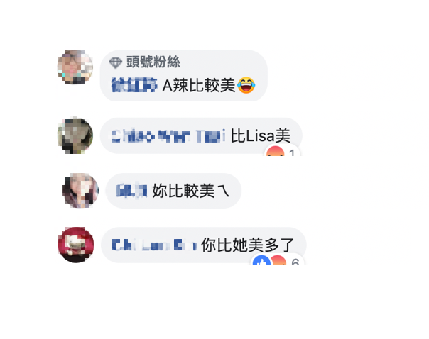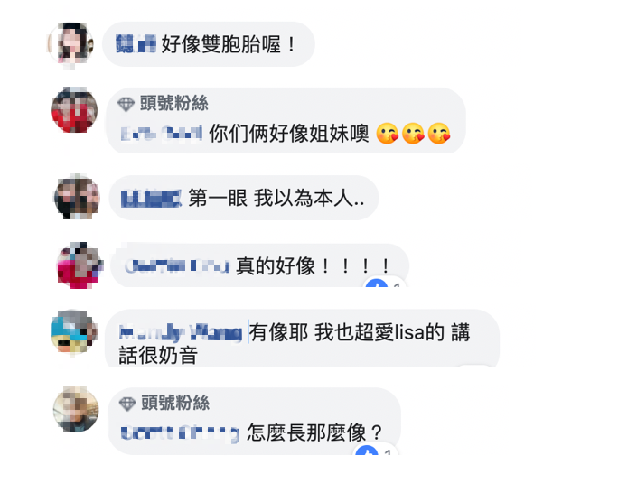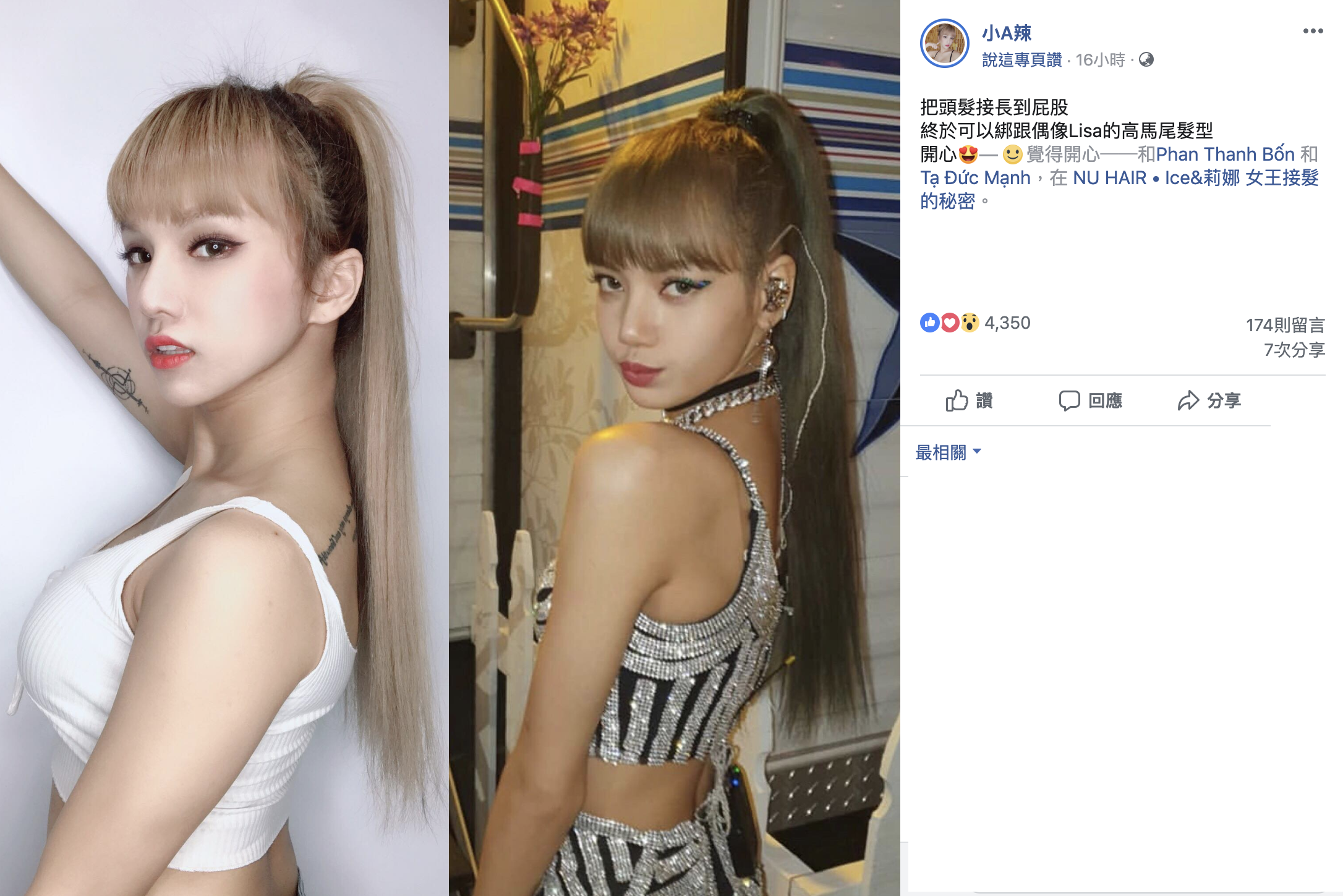 昨日小A辣在粉絲專頁上和粉絲們分享他去接髮的成果,並寫下:「把頭髮接長到屁股,終於可以綁跟偶像Lisa的高馬尾髮型,開心」,除了附上影片之外,小A辣更將自己和Lisa的照片拼貼在一起,然而兩人的瀏海皆是平瀏海,且馬尾的高度以及髮尾的長度皆非常相似,除了髮型之外,小A辣的妝容以及服裝都和Lisa非常接近。網友也紛紛留言:「怎麼長那麼像?」、「有像耶」、「好像雙胞胎喔!」、「第一眼我以為本人」、「你們倆好像姊妹喔」,更有網友大讚:「你比她美多了」