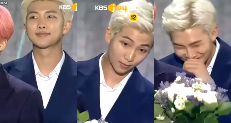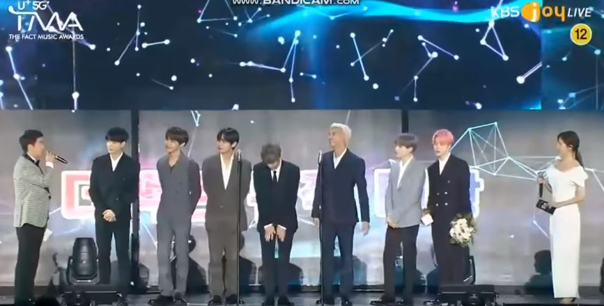 24日晚間,由媒體《The Fact》舉辦的音樂頒獎典禮「U+5G THE FACT MUSIC AWARDS」在仁川舉辦,當天防彈少年團也抱回4大獎項包括最高榮譽大獎、最佳專輯獎、年度歌手獎和人氣獎。不過當天輪到Jimin正經發表感言時,半身鏡頭就捕捉到RM突然低頭摀嘴偷笑,還拍了一旁的Jin,直到鏡頭拉遠,粉絲才發現,似乎因為麥桿太高,Jimin竟然雙腳站到了底座上面,理所當然的模樣讓一本正經的RM終於忍不住笑場。