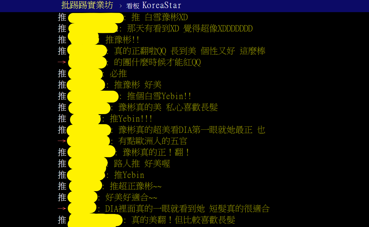 許多網友看到照片後紛紛留言,表示「推 白雪豫彬」、「真的正翻啦QQ 長到美 個性又好 這麼棒」、「推個白雪Yebin」、「豫彬真的美 私心喜歡長髮」、「豫彬真的超美看DIA第一眼就她最正」、「我的天 好美 真的超漂亮」,這次豫彬打扮成白雪公主獲得網友廣大好評,而近期DIA也持續為新歌WooWa積極活動中。