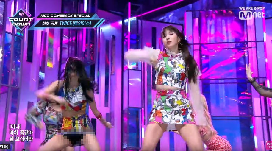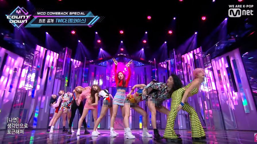 22日,韓國女團TWICE終於以新專輯《Fancy You》回歸,而回歸Showcaes成員統一的黑色系服裝,就展現出不同以往的性感風格,昨(25)日晚間,TWICE登上音樂節目《M!Countdown》演出,不過多數成員身穿膝上裙,而舞蹈中也有大量開腿的動作,配合由下往上拍的鏡頭,讓成員的安全褲都若隱若現引起網友不滿,更心疼「真的很犧牲」。