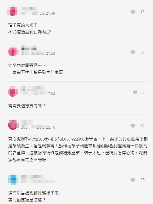畫面一出,也引起台灣論壇「dcard」上的網友以主題「裙子太短了吧」引起討論,對此,有網友指責公司服裝設計並表示「短到只要張開腳步裙子就往上跑」、「Momo那件短到不像裙子」、「舞步那麼急根本沒時間拉裙子」,同時也有人出面批評拍攝方式說到「不懂為什麼要由下往上拍」,另也有粉絲提議「Lovelyz的打歌服幾乎都是裙裝為主,但是就算有大動作而裙子飛起來都能明顯看到裡面有一件很長的安全褲」引起大批網友心疼。