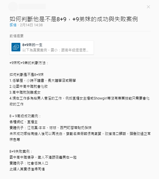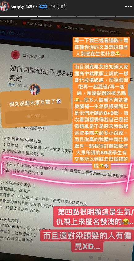 日前有網友在Dcard中發文《如何判斷他是不是8+9,+9弟妹的成功與失敗案例》,其中指出8+9的特點包含低學歷、國高中化妝、高中破處、工作多為給男人意淫等等,更直接舉出本本就是案例。而昨(25)日本本看見文章,則在IG無奈回應,認為這些酸民只因為不喜歡她,便隨意編造她的故事,「每次看到都覺得我自己是記憶錯亂是不是,原來我做過這些事嗎?超多小說家」。