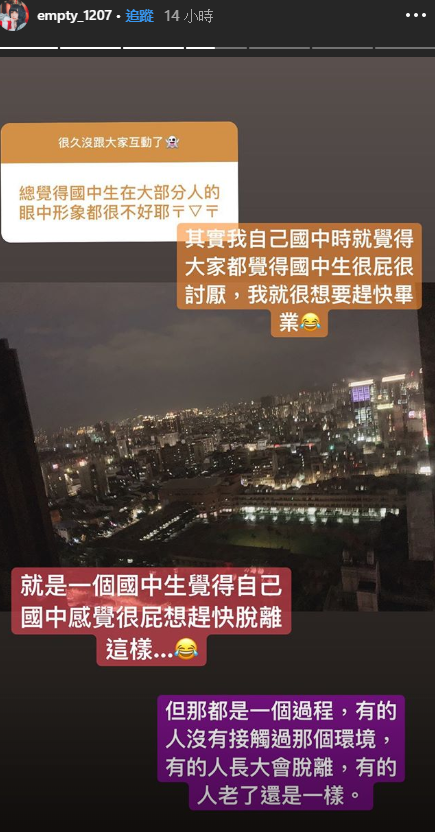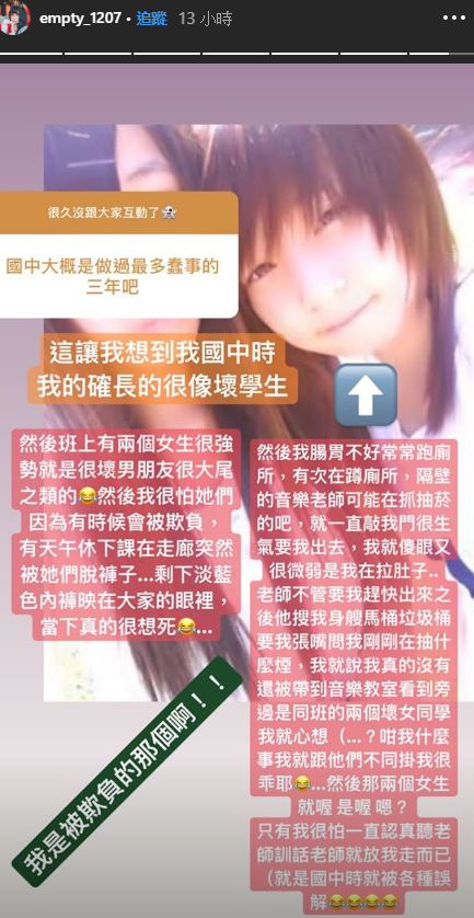 本本也提到自己以前國中階段,就因為感覺大家都覺得國中生很屁,所以很希望能夠趕快畢業,而她也接著分享自己的國中生活,更表示雖然自己外型很像壞學生,不過其實自己是被霸凌的一方。原來當時班上有兩位女生很強勢,更會欺負本本,讓她避之唯恐不及。她回憶某次下課走在走廊上,竟然無緣無故遭到兩個女生脫褲子,「剩下淡藍色內褲映在大家的眼裡,當下真的很想死」。