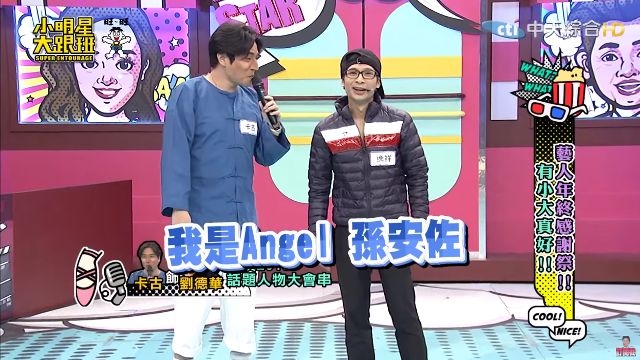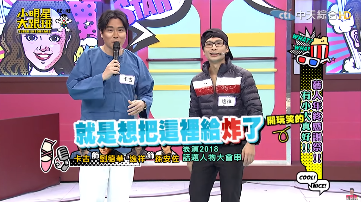 逸祥在今年1月底播出的《小明星大跟班》中模仿孫安佐,一進場就說:「我今天來到這邊就是想把這裡給炸了!」還說現在最想做的事就是在市政府開跨年演唱會,「這樣我就能把那裡給炸了!」吳宗憲瞬間露出尷尬的笑容,一旁的Sandy更是連笑都笑不出來,接著逸祥又繼續模仿孫安佐,硬是把兩個人搭在一起。