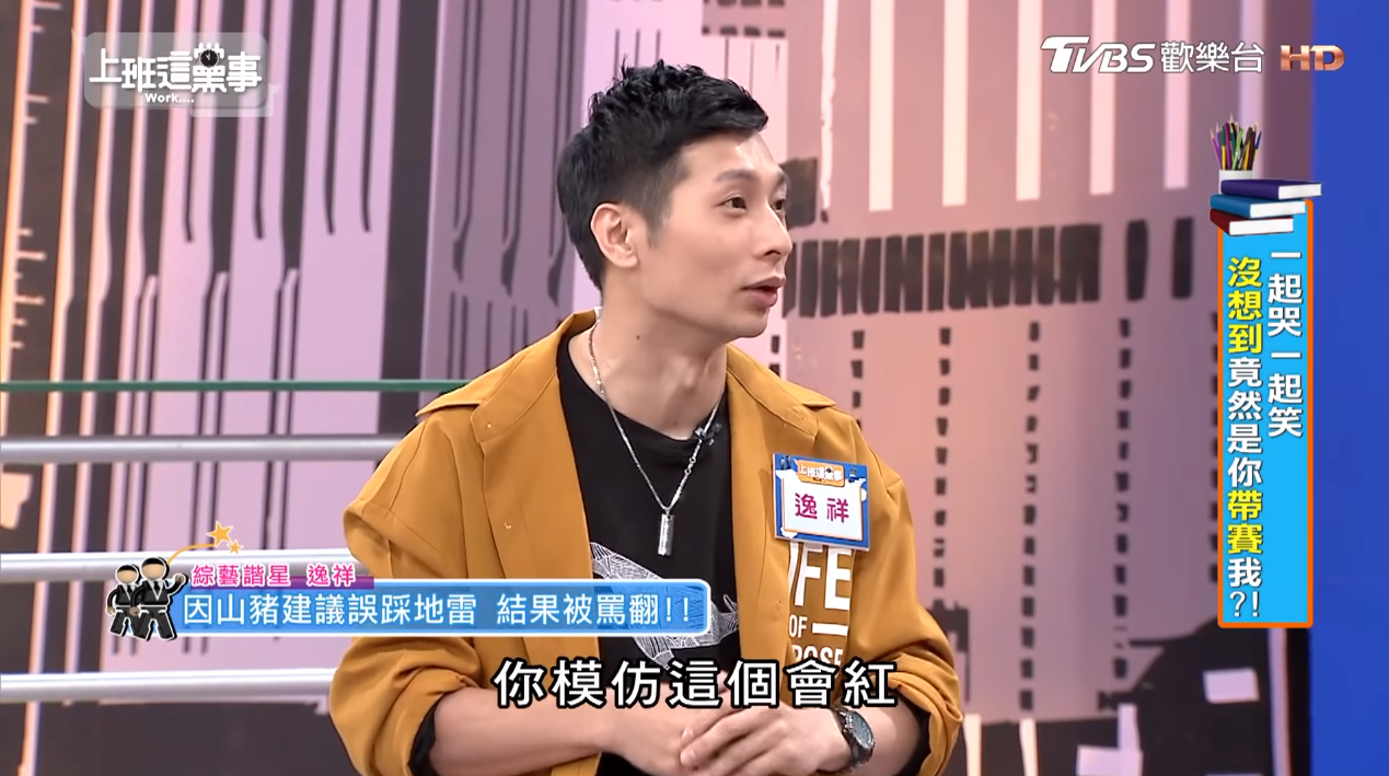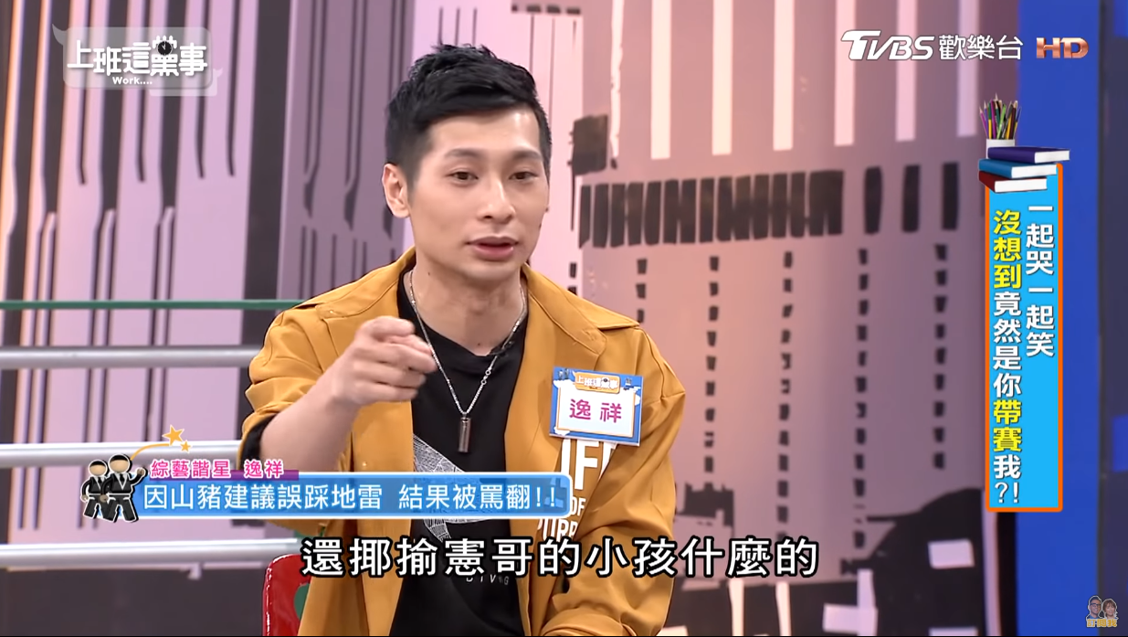 諧星逸祥因為模仿殺蛇爆紅,後來因為和女友白白分手一事鬧上新聞版面,一直以來星路都不是很順遂的逸祥,近日在《上班這黨事》透露,他曾在憲哥的節目中模仿孫安佐,還引用鹿希派的話,讓吳宗憲和Sandy一陣尷尬,網路上罵聲四起,甚至還被該節目封殺,抱怨這全都是被山豬給聰康:「我被害很慘!」