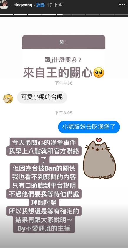 有趣的是有網友就問妮妮「跟JJ什麼關係?」,妮妮則貼上和「GodJJ王永傑」的對話截圖,只見妮妮被Ban台之後,王永傑便私訊關心:「可愛小妮的台呢?」,妮妮則打趣回應:「小妮被送去吃漢堡了」。而她也解釋,這次被Ban台,她也已經在25日早上八點便和twitch聯絡,「他們要我等待他們處理跟討論,所以我想還是等有確定的結果再跟大家說明」,她最後也打上「by 不愛翹班的主播」,可見這次還是十分無奈。