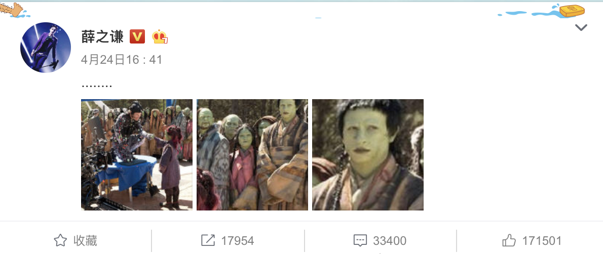 薛之謙24日在微博上發出了三張照片,並寫下:「........」,而該照片是《復仇者聯盟3》的拍攝花絮照,該幕場景旁邊有許多葛摩菈種族的人種,其中有一位被放大後發現他和薛之謙長得十分相似,薛之謙本人發出這些照片後,也不斷被網友留言吐槽:「你現在才知道?」、「哥哥你綠臉的樣子好帥」、「老哥你哪天客串的」、「我一直以為是你」、「你啥時候去群演了??」、「哥...真的像啊」、「哈哈哈哈哈哈哈太像了」,對於這組照片,粉絲們都笑翻。
