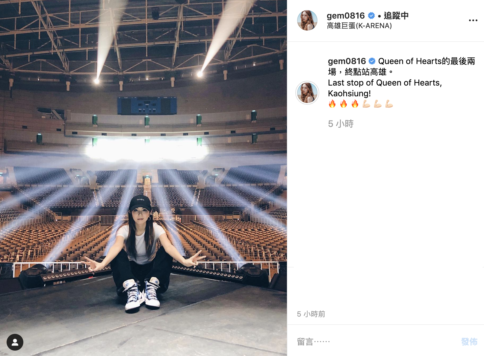 高雄場成為了《G.E.M. Queen Of Hearts 世界巡迴演唱會》的最終場,而鄧紫棋也在台上感動的淚崩,然而對於自己不斷被情緒影響演出,鄧紫棋也懊惱說道:「想給自己兩個巴掌」,演唱會結束後,粉絲也紛紛湧入鄧紫棋的IG貼文下替她加油打氣。