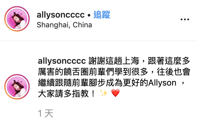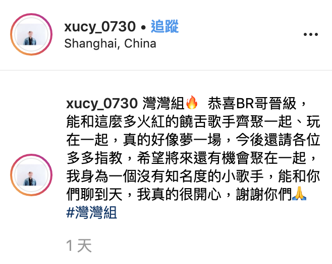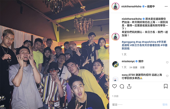 在昨日,參加《中國新說唱》的台灣好手周湯豪也在IG上發布一張大和台灣海選選手們的大合照,並寫下:「本是在遠端替你們加油,昨天剛好我也在上海,一接到消息,覺得一定要跟老朋友還有新同學聚一下!希望你們玩的開心,來日方長,我們一起加油!」,許多選手們雖然無緣晉級下一輪,但都紛紛在個人的IG上發出照片,並表示很開心可以認識其他說唱好手們。