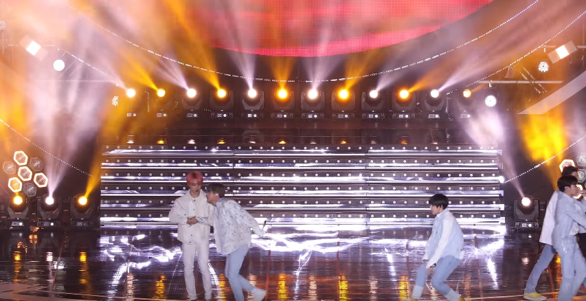 防彈少年團28日受邀參加SBS電視台舉辦的《 SUPER CONCERT》,當天表演陣容十分的強大,許多當紅團體紛紛出席此演唱會,吸引了大批的粉絲入場。防彈少年團一連表演了歌曲《 Boy With Luv》、《 DNA》、《Make It Right》、《 IDOL》,就在他們快表演到歌曲《 IDOL》中的rap時,站在隊伍正中間的成員Jin突然左腳重心不穩,一個踉蹌的滑倒,因為頓時尾椎先著地,讓他呆坐在原地五秒,其他成員也被嚇傻,正輪到自己part的Suga連忙上前關心,但表演仍持續進行,最後由Jimin攙扶他站起來,畫面中看到Jin走路還有點不穩,可見是相當的痛,這一摔讓台下粉絲相當心疼,紛紛表示「希望他可以趕快好起來」「他這一摔我心跳都快停了」「Jimin真的是天使」。