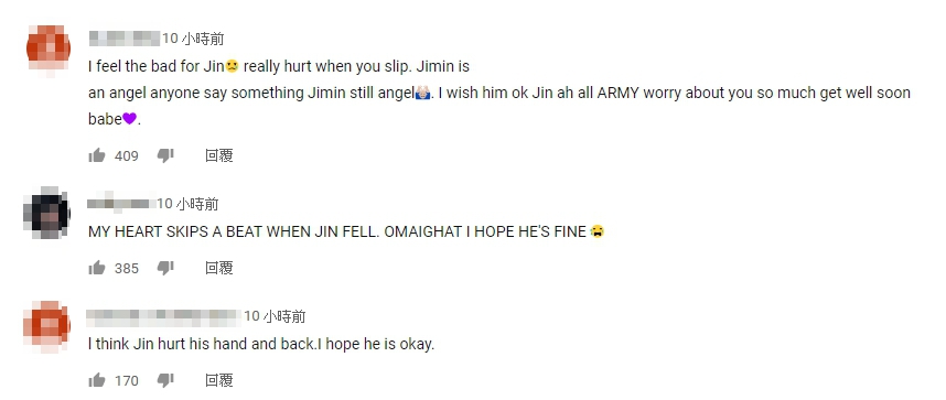 而在Jin跌倒後,他們移動到副舞台將歌曲表演結束,許多粉絲仍相當關心Jin的狀況,所幸在表演結束後,防彈少年團在網路上發布了團體照片,坐在中間的Jin看起來是沒有大礙,也讓粉絲鬆了一口氣,並希望他之後可以更注意自己的身體安全。