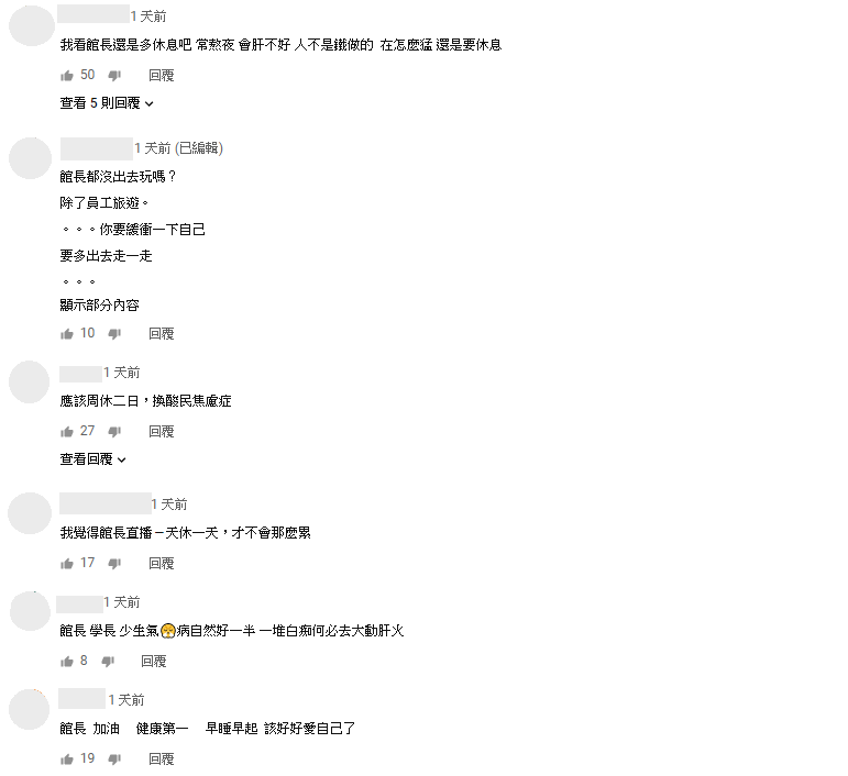 不過雖然館長和大家提到自己脆弱的一面,同時他卻也十分驕傲地表示自己的健身房、品牌的衣服都有品質保證,所以很多不認同他的人也會認同他的產品!而這段影片被放到網路上之後,則有許多粉絲留言:「我看館長還是多休息吧 常熬夜 會肝不好 人不是鐵做的 再怎麼猛 還是要休息」、「你要緩衝一下自己 要多出去走一走」、「我覺得館長直播ㄧ天休一天,才不會那麼累」、「館長 加油 健康第一 早睡早起 該好好愛自己了」,幫他加油打氣。