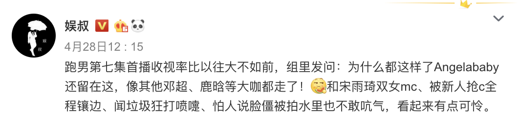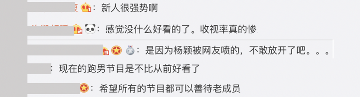 第一集播出後,在微博上也掀起一陣討論,許多網友認為少了過去的班底節目變得不好看,且新人的加入也搶走了Angelababy的C位,紛紛留言:「希望所有的節目都可以善待老成員」、「現在的跑男節目是不比從前好看了」、「是因為楊穎被網友噴的,不敢放開了吧」、「感覺沒什麼好看的了。收視率真的慘」、「新人很強勢啊」,但也有許多粉絲出面幫Angelababy說話,認為她相當照顧新人,不會故意搶風頭或是硬要站C位。