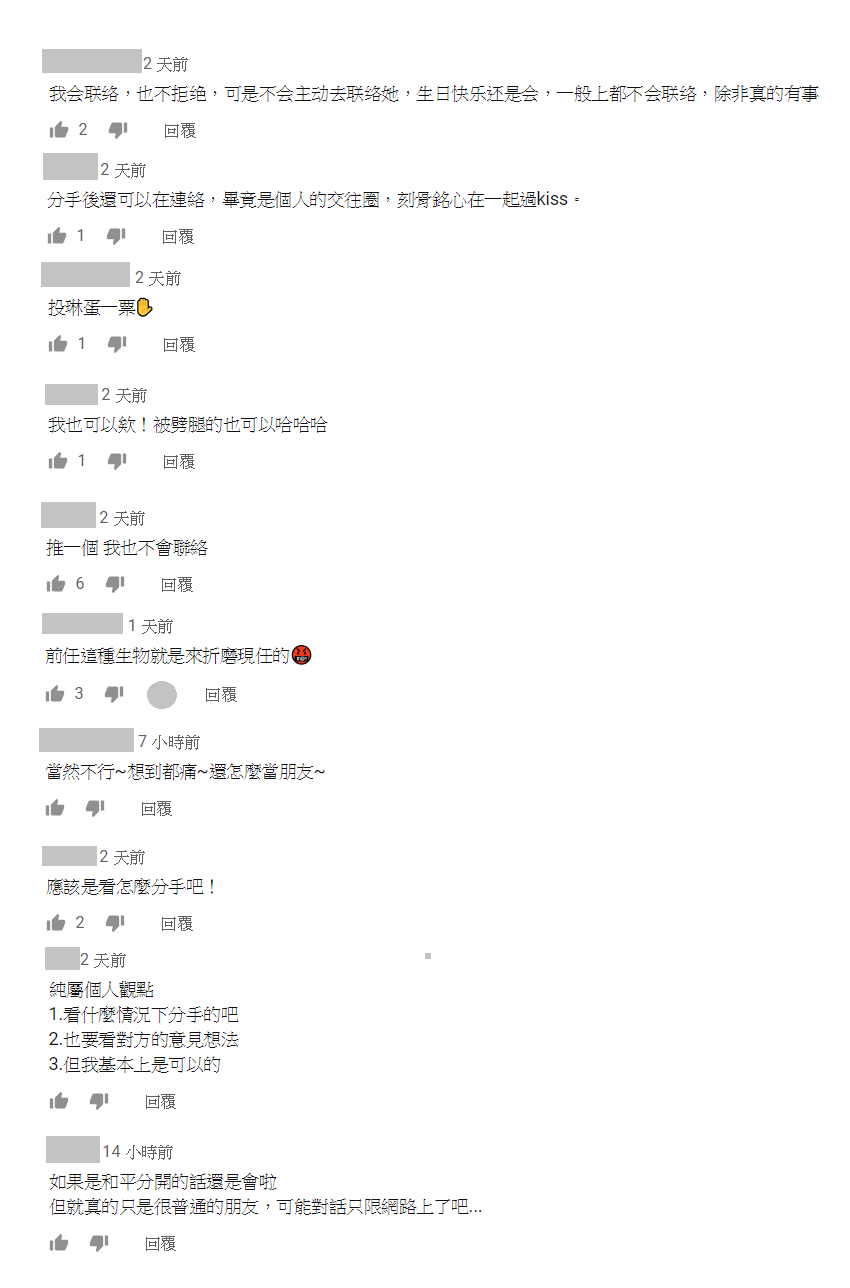 而這次的主題,也觸發了許多網友內心的看法,有不少網友紛紛表示支持「琳妲」「分手後還可以在連絡」「投琳蛋一票」「我也可以欸!被劈腿的也可以哈哈哈」,也有人持反對立場表示「推一個 我也不會聯絡」「前任這種生物就是來折磨現任的」「當然不行~想到都痛~還怎麼當朋友~」,但更多人認為應該視「分手」情況決定。