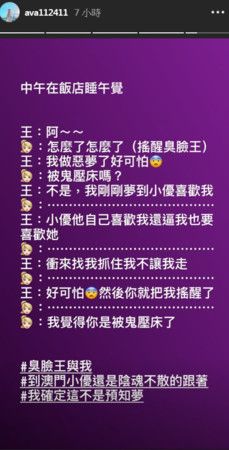 昨(28)日凌晨,丫頭在IG限時動態透露,男友睡覺睡到一半突然發出怪聲,她連忙把對方搖醒,沒想到男友醒來後面有難色的說:「我做惡夢了好可怕!」丫頭以為他被鬼壓床,但男友卻說:「不是,我剛剛夢到小優喜歡我!」讓丫頭聽了當場傻眼。