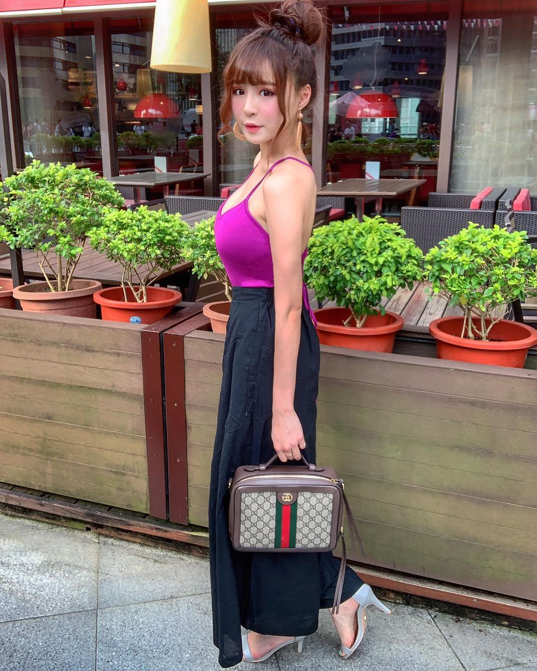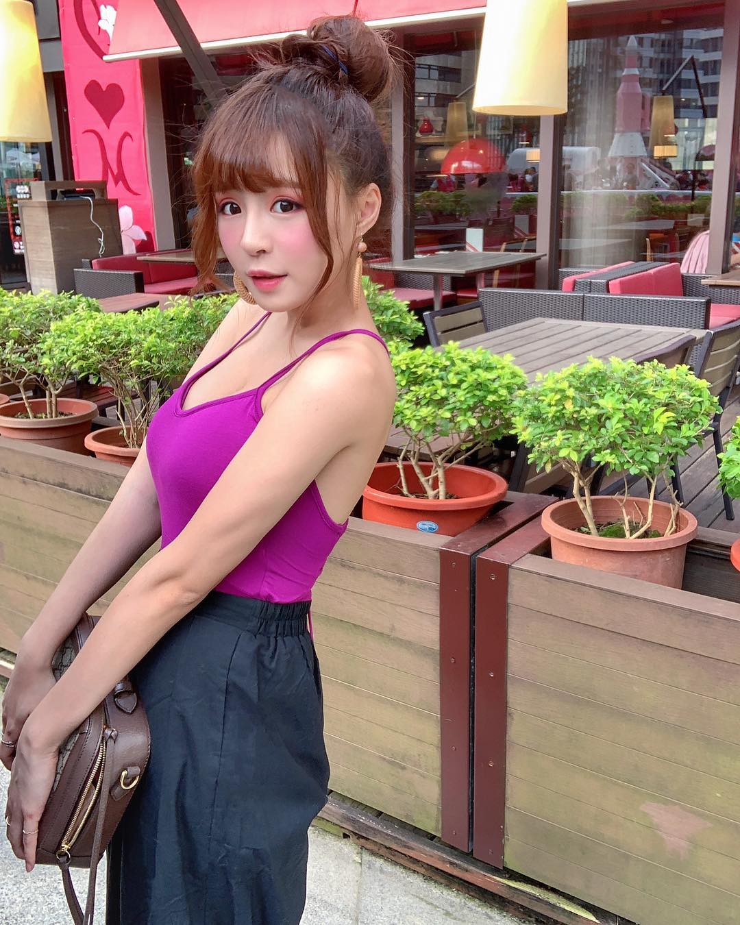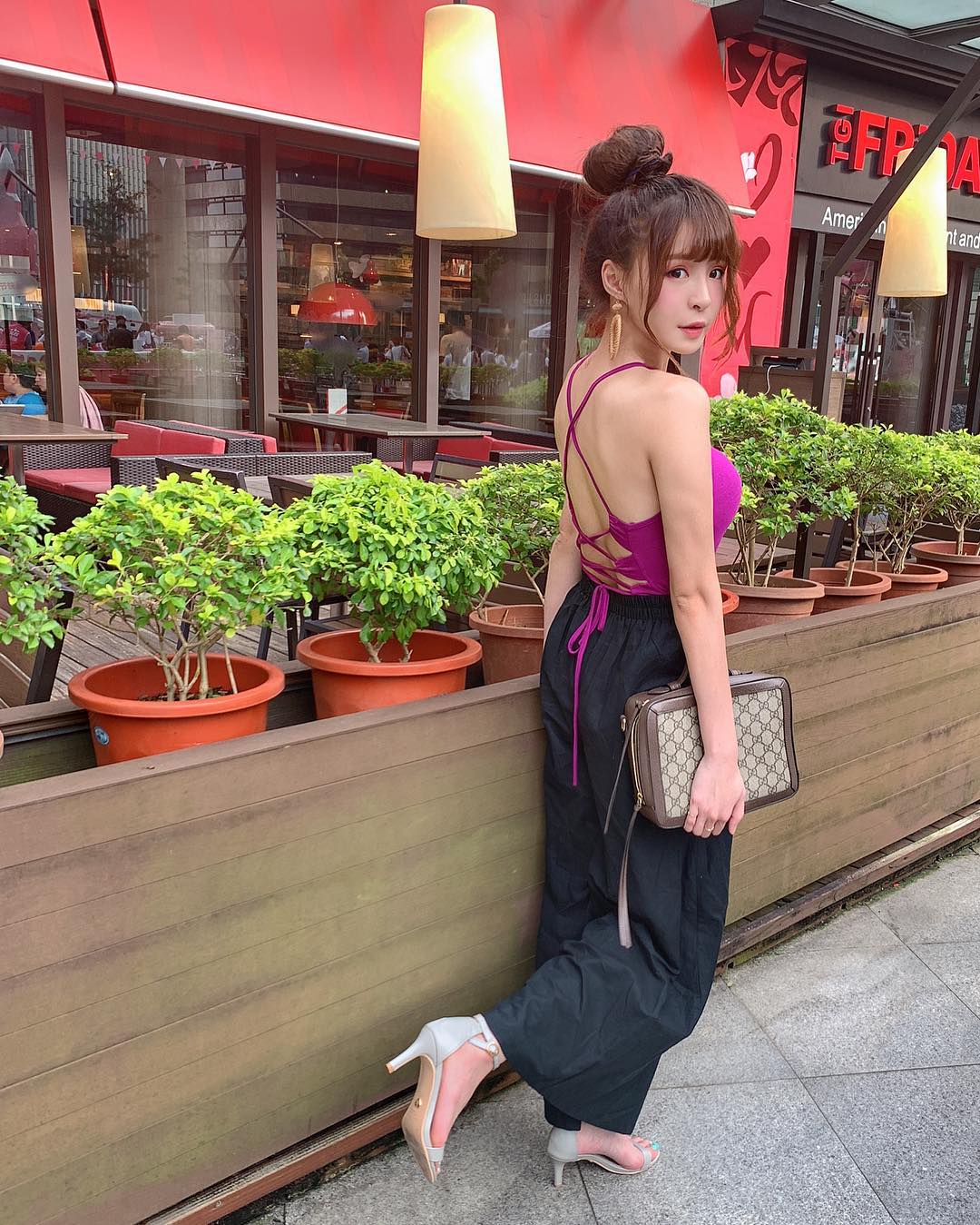 前幾天台北高溫炎熱,元元在貼文中寫著:「真的熱到在家都會流汗,穿一個涼涼的出門~頭髮綁起來就是舒服。」照片中,只見元元穿著一件亮紫色的細肩帶低胸背心,下半身搭配著深藍色的休閒打摺落地褲,再配上一雙淺灰色的高跟涼鞋。雖然元元側身站著,但深邃的事業線依舊清晰可見;沒想到元元一轉身,背後是引人遐想的交叉綁帶設計,白皙美背更是一覽無遺,讓粉絲們大飽眼福。