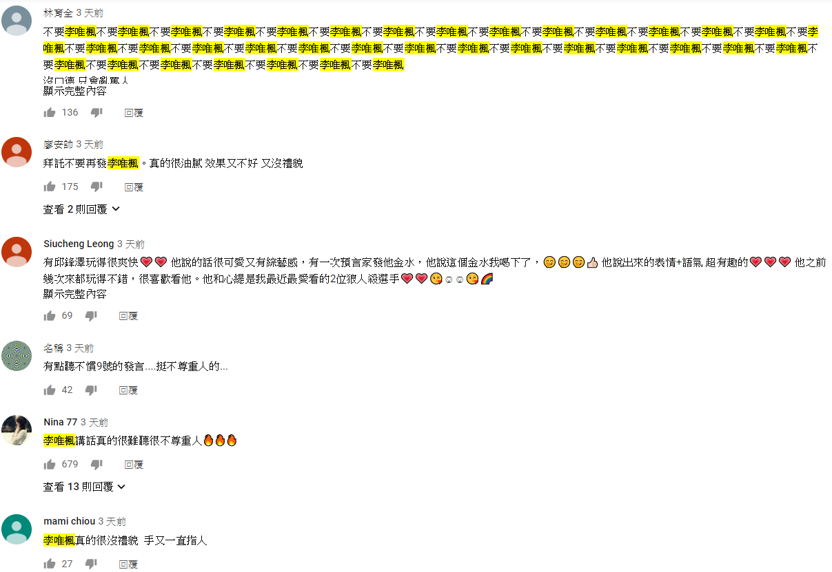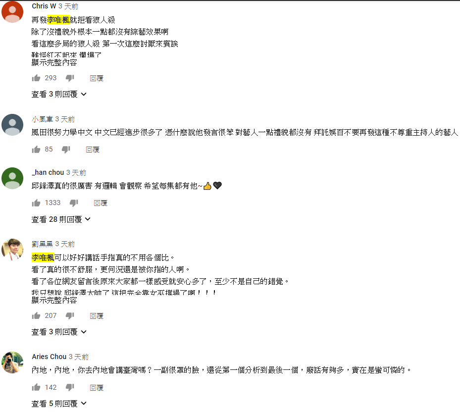 不僅如此,在遊戲過程中李唯楓卻常常話中帶刺攻擊其他來賓,先是說聽不懂風田講的話,第二輪更直言「風田發言很笨」,讓風田尷尬說「我回家練習中文」;接著他在分析時,全程不斷用手指著來賓,講話的語氣態度不是很好,且還面露不屑,還指責別人說話坑坑巴巴,讓網友看了非常生氣。