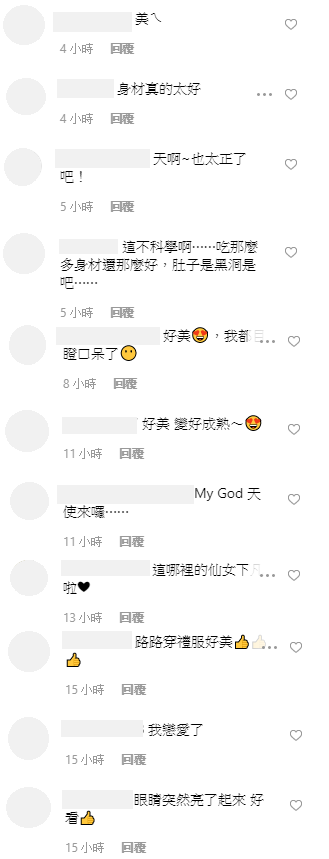 路路也打上:「看到家人的一臉疲倦跟鏡頭前的緊張,那工作中的我就算再累也不能展現出來,我可是女強人」,讓粉絲看見她堅強、自信的一面。而這次路路分享性感照片,粉絲也紛紛留言:「超漂亮的」、「我流鼻血了」、「這不科學啊⋯⋯吃那麼多身材還那麼好,肚子是黑洞是吧⋯⋯」、「身材真的太好」、「好美 變好成熟~」。