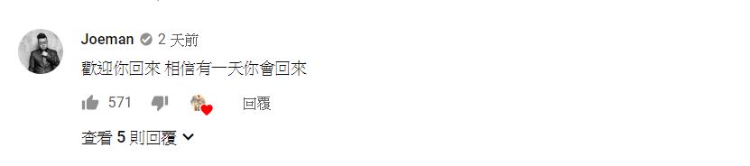誠如影片中「冏星人」所分享的小故事「我愛你不後悔」,相信對於「冏星人」來說,她所經歷的一切都是她深愛並且不後悔之事,而影片下方YOUTUBER Joeman更現身祝福「歡迎你回來 相信有一天你會回來」,也誠如觀眾們給予她的祝福「一切都會變得更好」,「冏星人」定能克服一切迎向更好的未來。