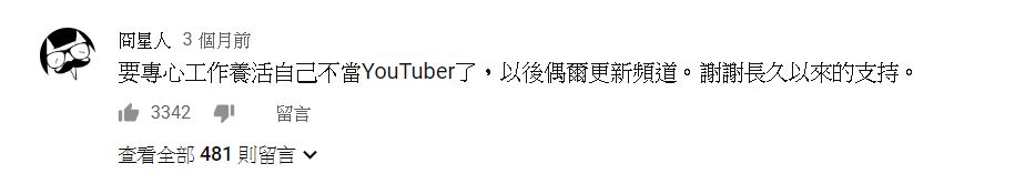 在今年一月中旬時,「冏星人」於自己的頻道中發佈了一則引退訊息,內容寫道「要專心工作養活自己不當YouTuber了,以後偶爾更新頻道。謝謝長久以來的支持。」當時粉絲們也紛紛寄予「冏星人」無限的祝福。