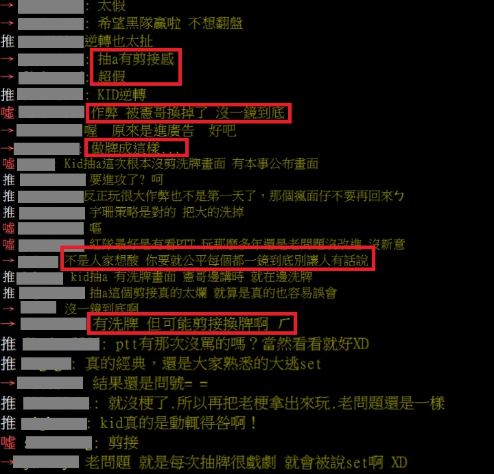 事實上,在KID開始抽牌之前吳宗憲確實是有洗牌的,且在姚元浩抽牌時,吳宗憲還特別攤開手上的牌強調,抽牌一定會公平公正:「牌都在我手裡好不好,我們這個批踢踢上面譙得很兇,稍微一點點我們的執法不公,馬上就被修理了!」至於鏡頭沒有拍到的部分,似乎也只能等待紅隊還原實情了。