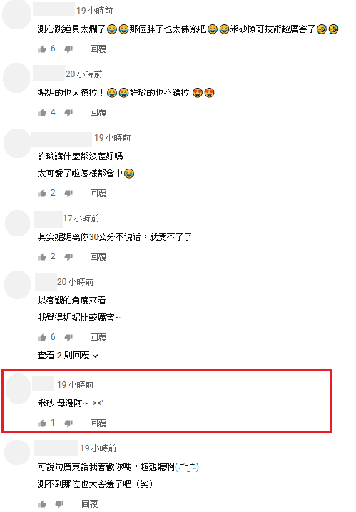 其實比賽最後,粉絲便投票選出最撩人的冠軍是許瑜,不過理由卻是因為自己是許瑜的粉絲,讓米砂、妮妮直呼「原來這是一個自肥的影片」。而影片播出之後,網友則客觀分析妮妮才是最會撩哥的冠軍,而因為米砂說話大膽,粉絲也搞笑調侃:「米砂母湯啊」。