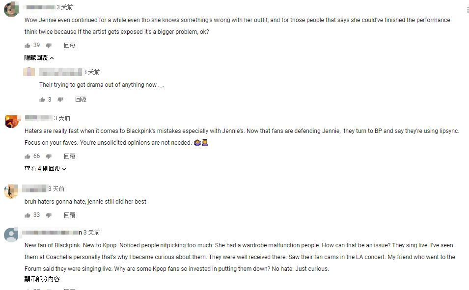 然而Jennie差點走光的影片外流後,卻被網友指出Jennie應該堅持完成演出不該中途下台,不過也有粉絲出面護航「如果藝人走光了,問題會更嚴重」,此外更有黑粉批評整首歌曲都是對嘴演唱,為此,就有參與過洛杉磯場的觀眾表示「他們都是現場演出」希望弭平外界疑慮。