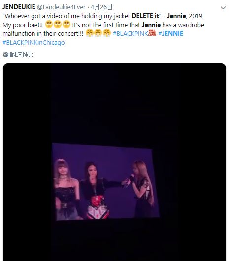 韓國女團BLACKPINK近期除以新專輯《Kill This Love》回歸,結束國內宣傳目前正在美國6大城繼續世界巡迴演出,下個月也將飛往歐洲站,不過24日在芝加哥演出時,Jennie的上衣拉鍊蹦開讓他不能完成演出,對此,Jennie事後除了向觀眾道歉,同時也要求外界「刪掉影片」並希望大家假裝沒發生。