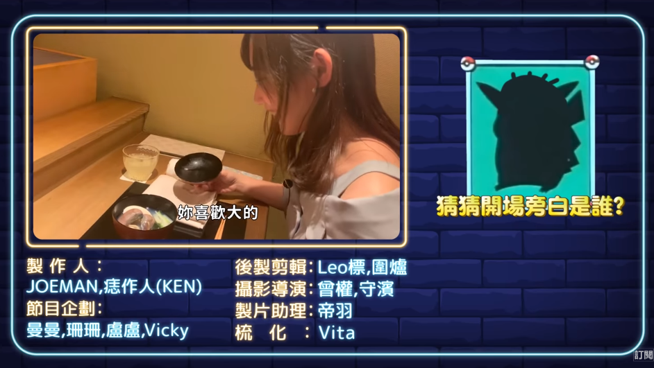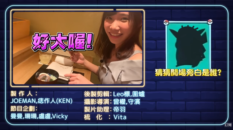 影片最後的花絮中,也可以看到在某道料理中,安啾見到餐點立刻驚呼:「好大喔」,而九妹也開黃腔說道:「你喜歡大的」,安啾聽了也停頓兩秒笑回:「不要釣我」,接著九妹也說道:「我喜歡大的,我買車都買大的」。