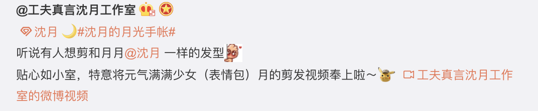 沈月因近日到日本工作,並且在當地換了新造型,在微博所上所發的美照,竟悄悄的將過肩長髮剪短,粉絲紛紛詢問是否換了新造型。在近日(5/1),沈月的工作室就曬出了一段,她在沖繩當地髮廊剪髮的Vlog說:「聽說有人想剪和月月一樣的髮型,特意將元氣滿滿少女(表情包)剪髮視頻奉上拉~」還原她剪髮的全部過程。