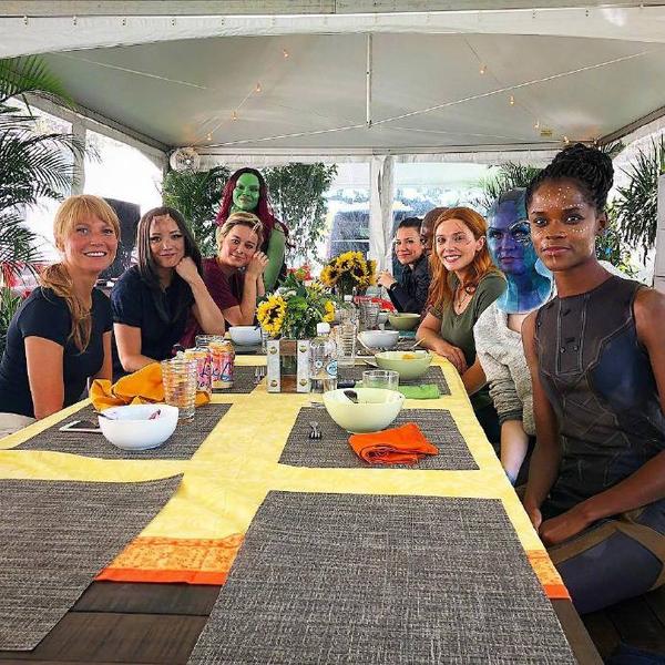 ▼這場眾星雲集的漫威女性聚餐上,可以發現演員們都用心化上了《復仇者聯盟 4》妝容,包含「葛摩菈」柔伊莎達娜(Zoe Saldana)費心把全身都塗綠、「黑豹妹」莉蒂西亞萊特(Letitia Wright)也完美呈現舒莉造型,有趣的是仔細一看「涅布拉」凱倫吉蘭(Karen Gillan),原來這位女演員選擇戴上了頭罩。