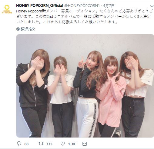 而去年3月出道,由三上悠亞領軍的女團Honey Popcorn繼去年底成員松田美子出走後,目前團體除留下的櫻萌子外,上月7日,Honey Popcorn則透過官方推特,以一張團體照向外界宣布新增3位成員,而針對回歸日期和成員正臉照則仍保持神秘,不過也預告即將推出新作品,讓外界相當期待。