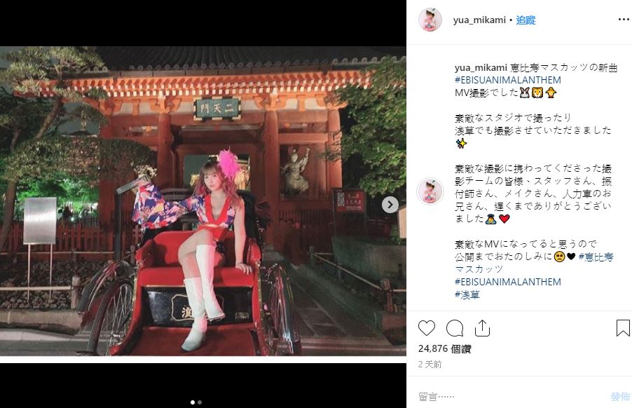 上月底,日本女星三上悠亞透過個人IG曝光團體惠比壽麝香葡萄即將推出新作品,而MV也已經在東京淺草完成拍攝,1日,三上悠亞以一張自拍照展示回歸新造型。照片中,三上悠亞的髮色從原本的淺棕色,又在髮尾挑染粉色,引起網友盛讚超級可愛,而當天MV造型則身穿改良式和服,前一張三上悠亞還將胸口刻意摀住,另一張照片他大方將雙手放開,和服深V設計一路開挖到下胸,雖然外罩一層薄蕾絲,不過豐滿上圍還是若隱若現,讓大批網友無法專注新髮色並直呼「好可愛又性感」、「怎麼這麼深」、「性感女神無誤」。