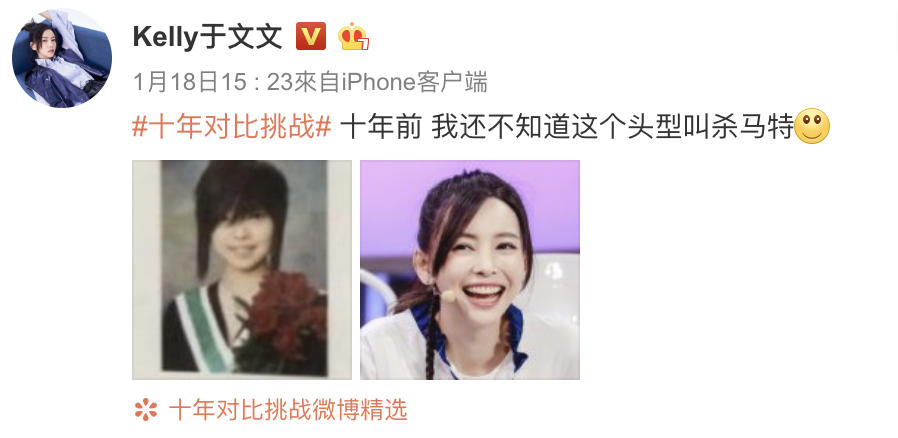 在今年年初相當流行的「10 year challenge」,于文文也曾發出自己十年前後的對比照片,十年前的照片雖然畫素有些低,但可以看出她髮型非常前衛,瀏海也有些參差不齊,然而過去也不時有她整型的傳言,也有疑似她整形前的照片流出,而現在的她五官也更加立體,也變得漂亮許多。這次于文文摔倒下巴有些破相,更讓網友開玩笑直呼:「正好可以證明你的下巴不是整的」