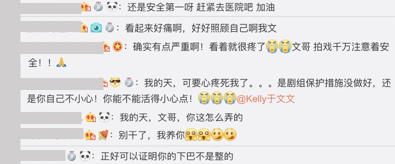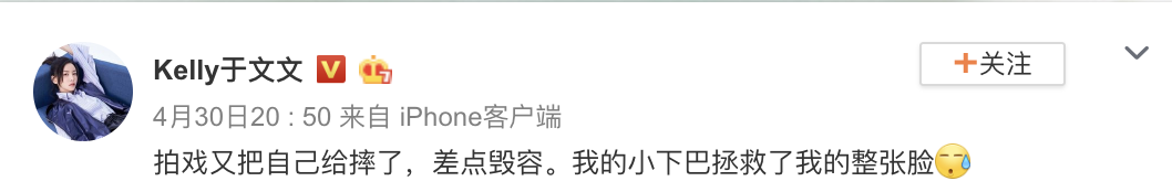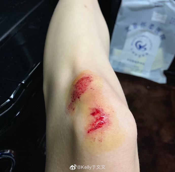 4月30日時,于文文在個人微博上發文寫下:「拍戲又把自己給摔了,差點毀容。我的小下巴拯救了我的整張臉」,並附上兩張傷口的照片,膝蓋的地方有大片的擦傷,滲出許多鮮血,而她的下巴也有大塊瘀青,微微滲出一些血絲,腫的相當大,照片看起來相當怵目驚心。然而粉絲們看見傷口的照片後,也紛紛擔心的留言:「我的天,文哥,你這怎麼弄的」、「我的天,可要心疼死我了」、「還是安全第一呀 趕緊去醫院吧 加油」,更有網友霸氣地向她喊話:「別幹了,我養你」
