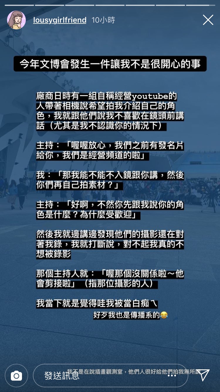 2019年的台灣文博會在4月26至28日登場,台灣許多插畫家如ㄇㄚˊ幾、廢物女友、某人日常、白爛貓等等知名插畫家皆出席共襄盛舉,而廢物女友作者近日也發文提起文博會上發生的事!作者在限時動態中發文:「今年文博會發生一件讓我不是很開心的事」,原來現場有一組YouTuber帶著相機希望她能自我介紹,不過因為不習慣面對鏡頭,並且根本不認識該創作者,廢物女友作者便詢問:「那我能不能不入鏡跟你講,然後你們再自己拍素材」,對方也同意並且開始訪問。