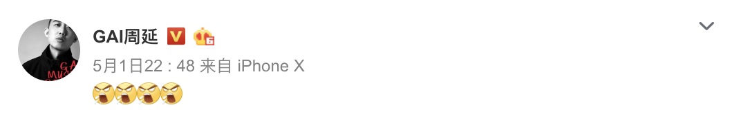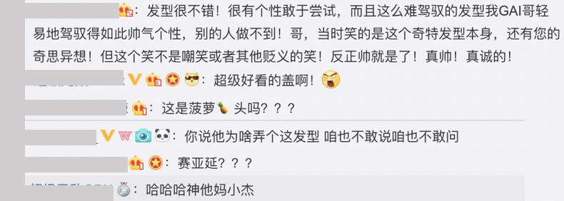 GAI在昨日晚間突然在微博上傳一張他在咪豆音樂節現場演出時的照片,並在內文附上四個生氣的貼圖,而照片中GAI的造型相當特別,他的髮型和以往不同,抓成神似卡通「超級賽亞人」的造型,也有另一派網友認為這造型很像「獵人」的小傑,大家看見GAI如此奇特、突破性的造型後,也紛紛留言:「髮型很不錯!很有個性敢於嘗試,而且這麼難駕馭的髮型我GAI哥輕易地駕馭得如此帥氣個性,別的人做不到!」、「這是鳳梨頭嗎???」、「超級好看的蓋啊!」