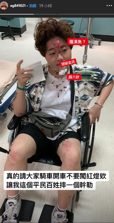 遇三寶闖紅燈!網紅「金玉」慘摔車「頭破血流、縫六針」:要死你自己死!