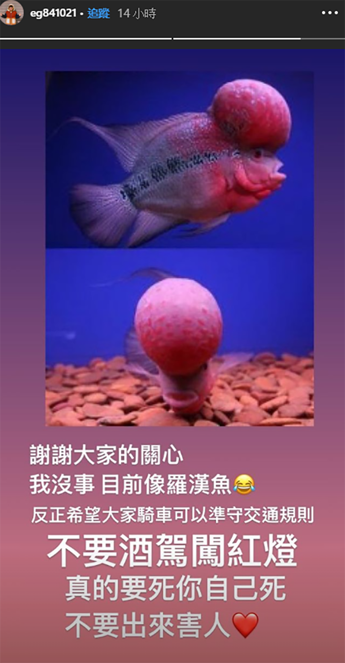 金玉也打上:「真的請大家騎車開車不要闖紅燈欸,讓我這個平民百姓摔一個X勒」,還貼上羅漢魚的照片,自嘲自己額頭的腫塊和羅漢魚有幾分神似,最後則再度呼籲:「反正希望大家騎車都可以遵守交通規則,不要酒駕闖紅燈,要死你自己死,不要出來害人」。