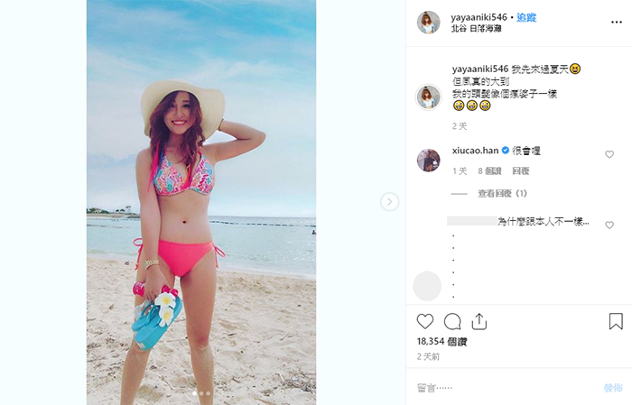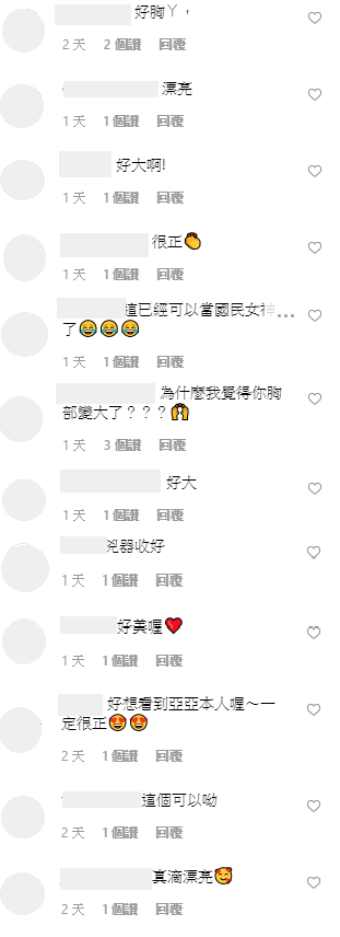 紛絲也紛紛留言:「為什麼我覺得你胸部變大了???」、「性感」、「大奶奶」、「好大啊!」、「很正」、「美翻了」、「已經可以當國民女神了」、「兇器收好」、「可以可以滿點」,大讚亞亞的好身材似乎又升級了,就連草爺都在下方回應:「很會喔」,而亞亞也搞笑調侃:「只能這樣吸引你的留言」。